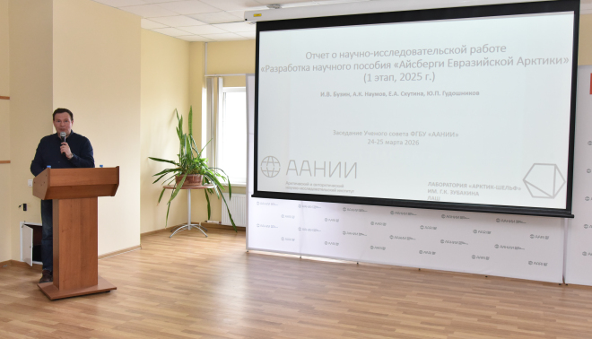 Также на заседании старшим научным сотрудником Лаборатории «Арктик-шельф» им. Г.К. Зубакина Игорем Бузиным были представлены результаты работ по первому этапу выполнения научно-исследовательской работы «Разработка научного пособия «Айсберги Евразийской Арктики».